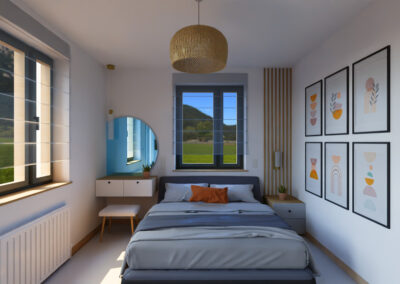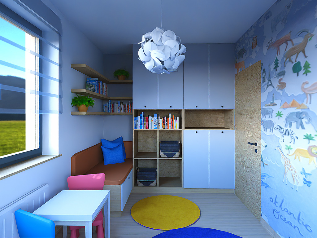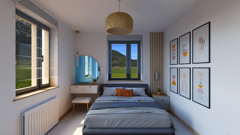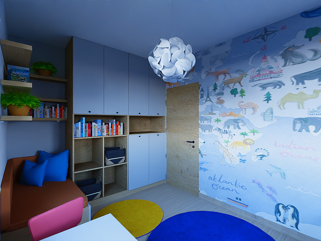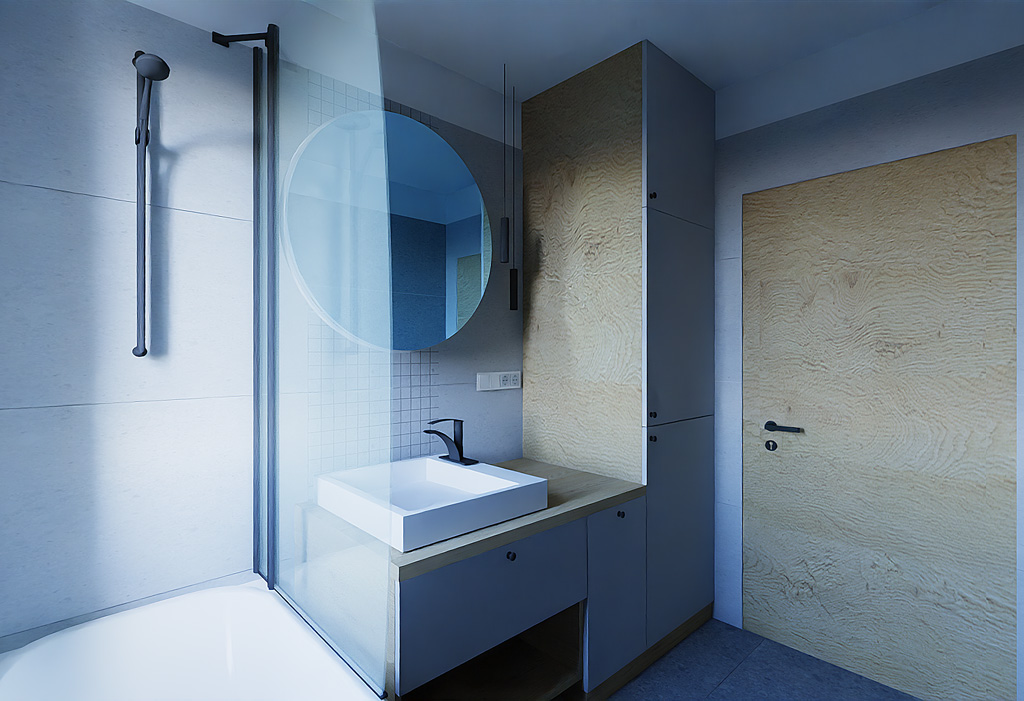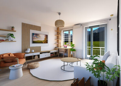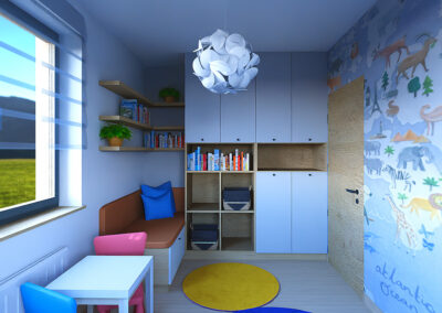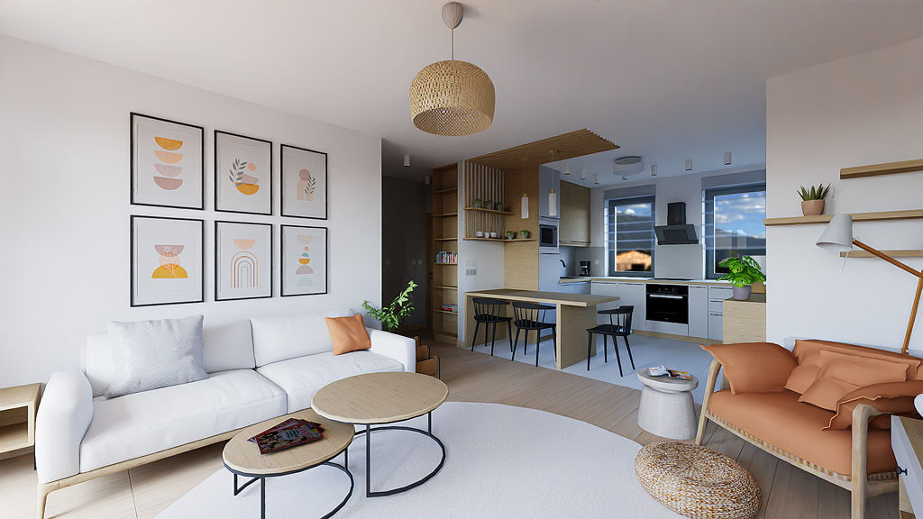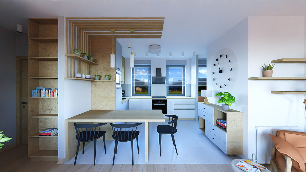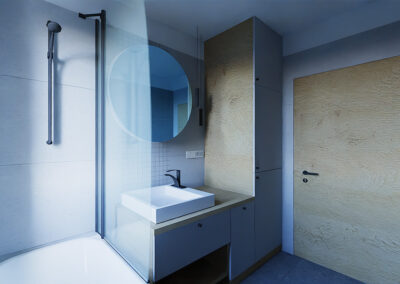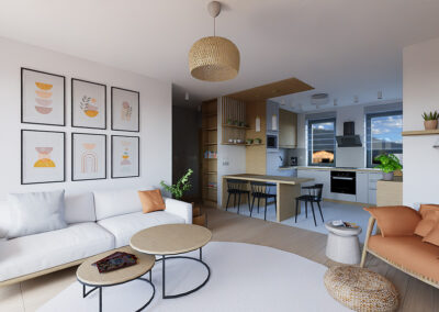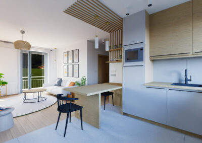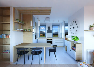 A 3 fős család azzal keresett meg, hogy lakásukat minimális átalakítással szeretnék az átlagostól eltérő életükhöz igazítani. A szülők most indítják be karrierjüket, azért kisgyermekükre a héten többször is a nagymama vigyáz, aki ilyenkor náluk is alkszik. A kapott alaprajzon – tekintettel a szűkös költségkeretre – mindössze egy falat bontottunk, illetve egy szerelőfalat építettünk, amivel tárolásra alkalmas helyet hoztunk létre, valamint egy tolóajtót vettünk ki. A konyha, az étkező és a nappali egy légtérbe került, míg a hálószobákat egy kis közlekedőről lehet megközelíteni, ami biztosítja a kellő intimitást. Az otthoni munkavégzésre kialakított home-office szerves része a nappalinak, ami a minden helyiségben végigvezetett letisztult japandi jegyeket hordozó design-nak is köszönhető.