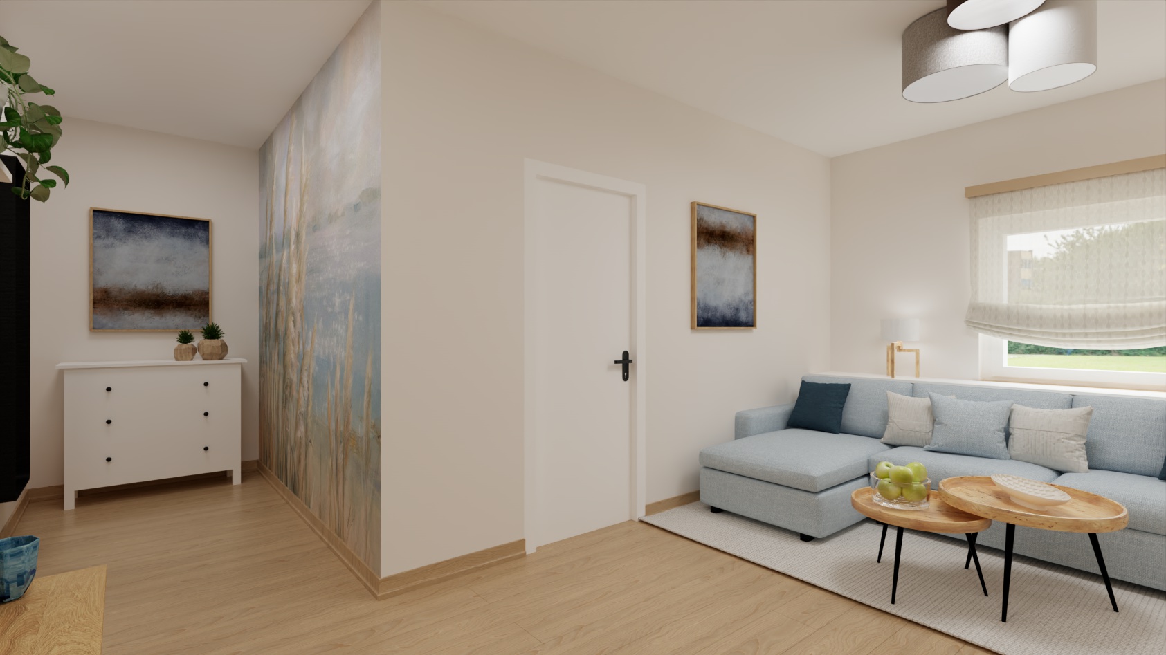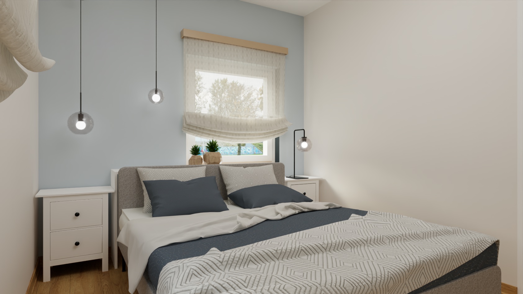 A design-ban a krém színű falakat a Balatont idéző kékkel egészítjük ki, a hangulatot egy nádas tapétával tesszükük igazán tópartivá.