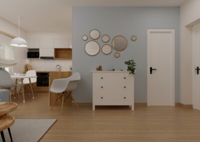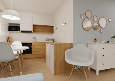 A Siófok kiemelt üdülő-övezetében található apartman felújításához kértek segítséget a tulajdonosok. A korábban egy nagy légterű lakásban a tervek szerint kialakításra kerül egy kényelmes méretű hálószoba, a szükségtelenül nagy fürdőszobából leválszatottunk egy különálló WC-t. A konyhabútor tervezésénél fontos volt a kis alapterület kihasználása.